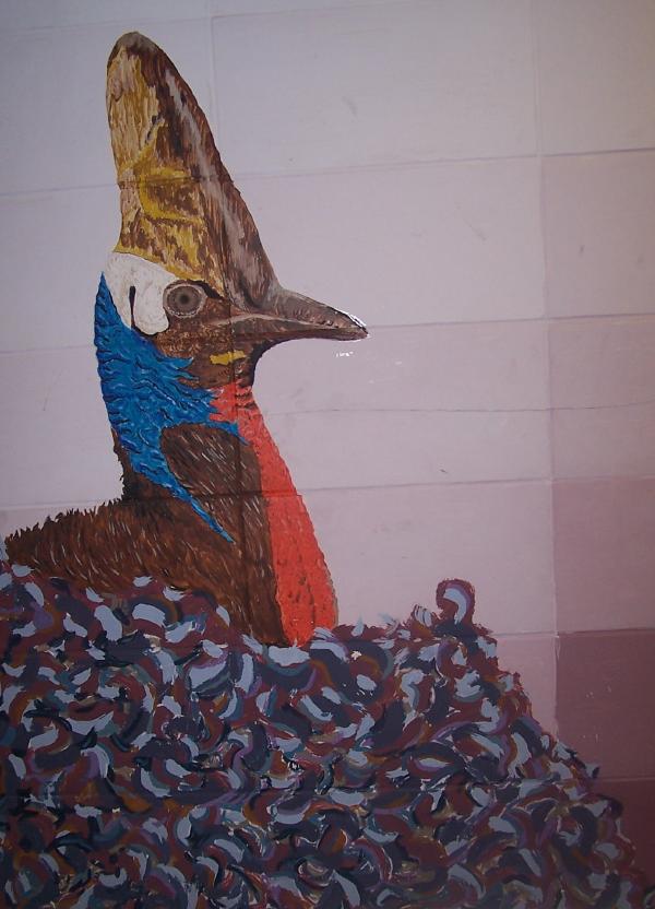 This painting stretches down a large wall and it features an extended scene of an African savannah that finally reveals a large baboon contemplating its domain. It won't take Art 101 to figure this one out.